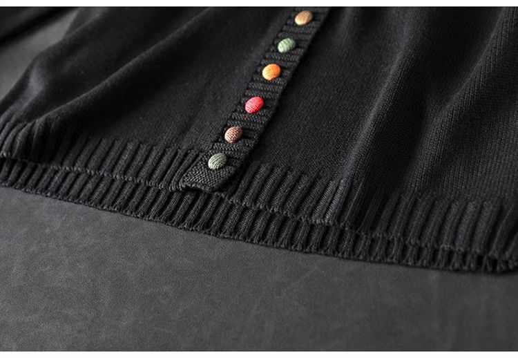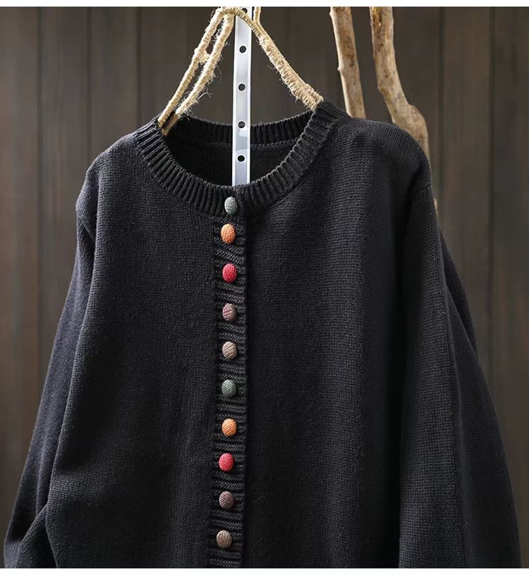 woman wearing a dark sweater with colorful buttons against a plain background.